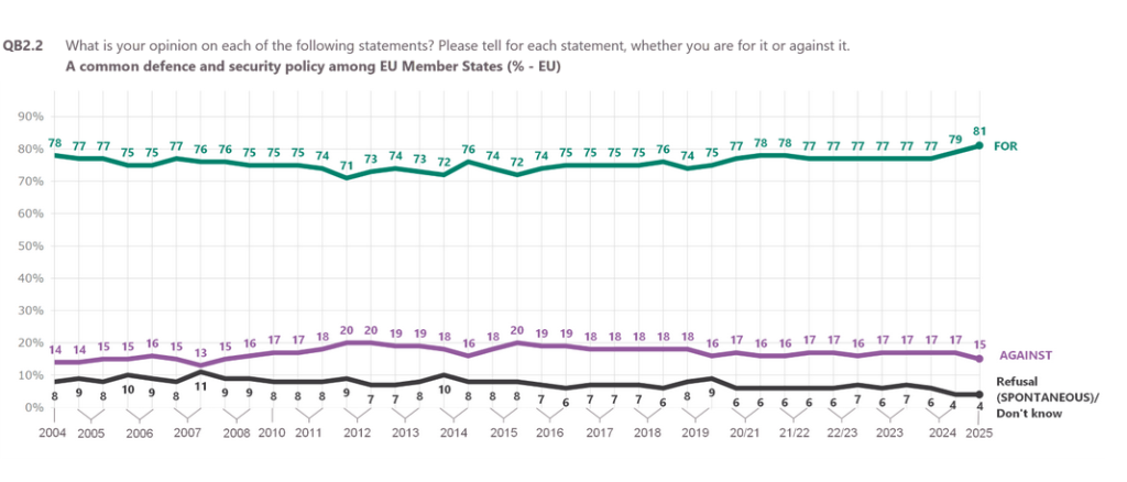 “Voters believe in a sovereign Europe more that elites” according to Politico.eu, citing the Spring 2025 Eurobarometer poll, which found that 81% of Europeans “are for a common defence and security policy among EU Member States – the highest result since 2004”.